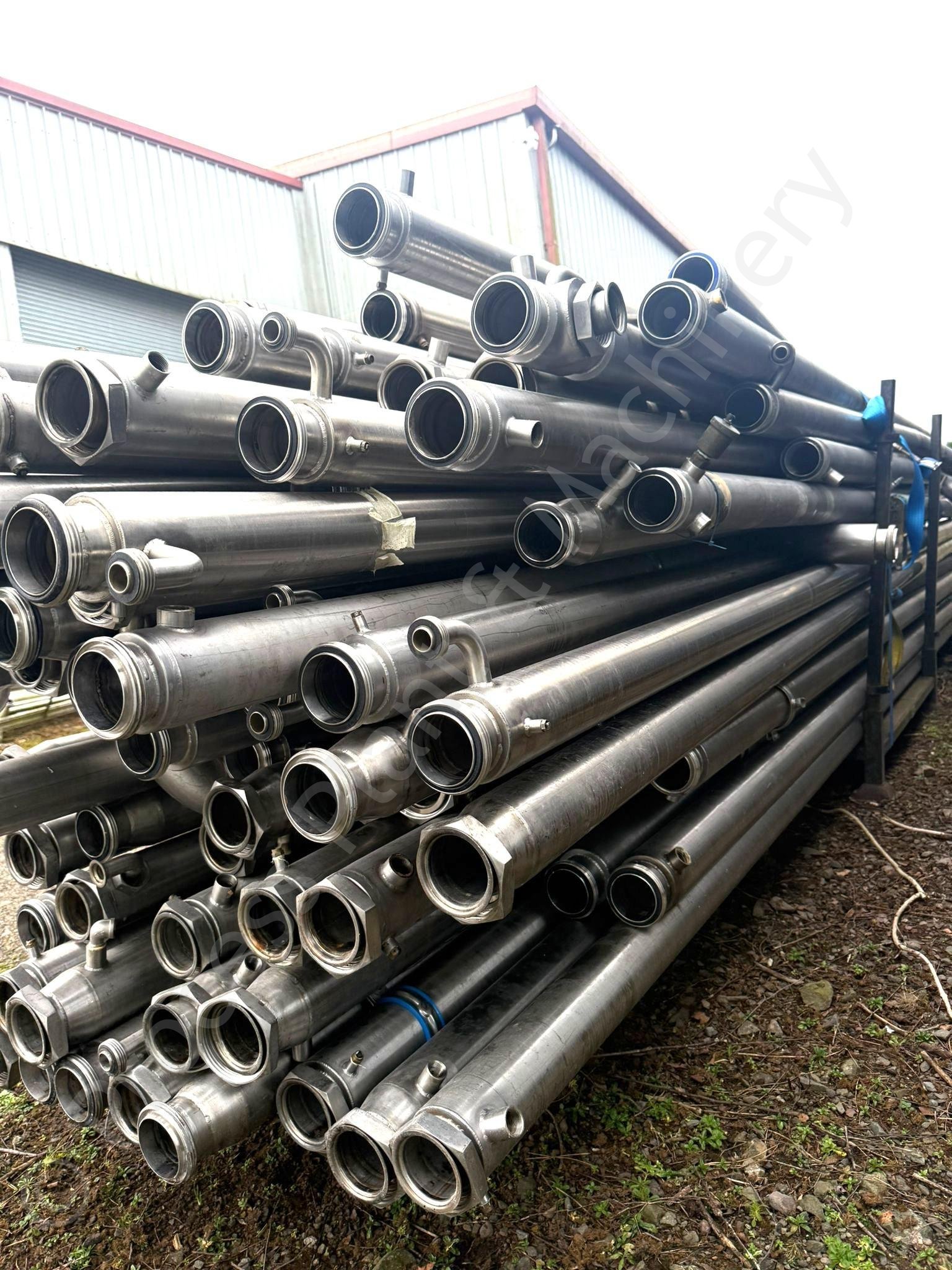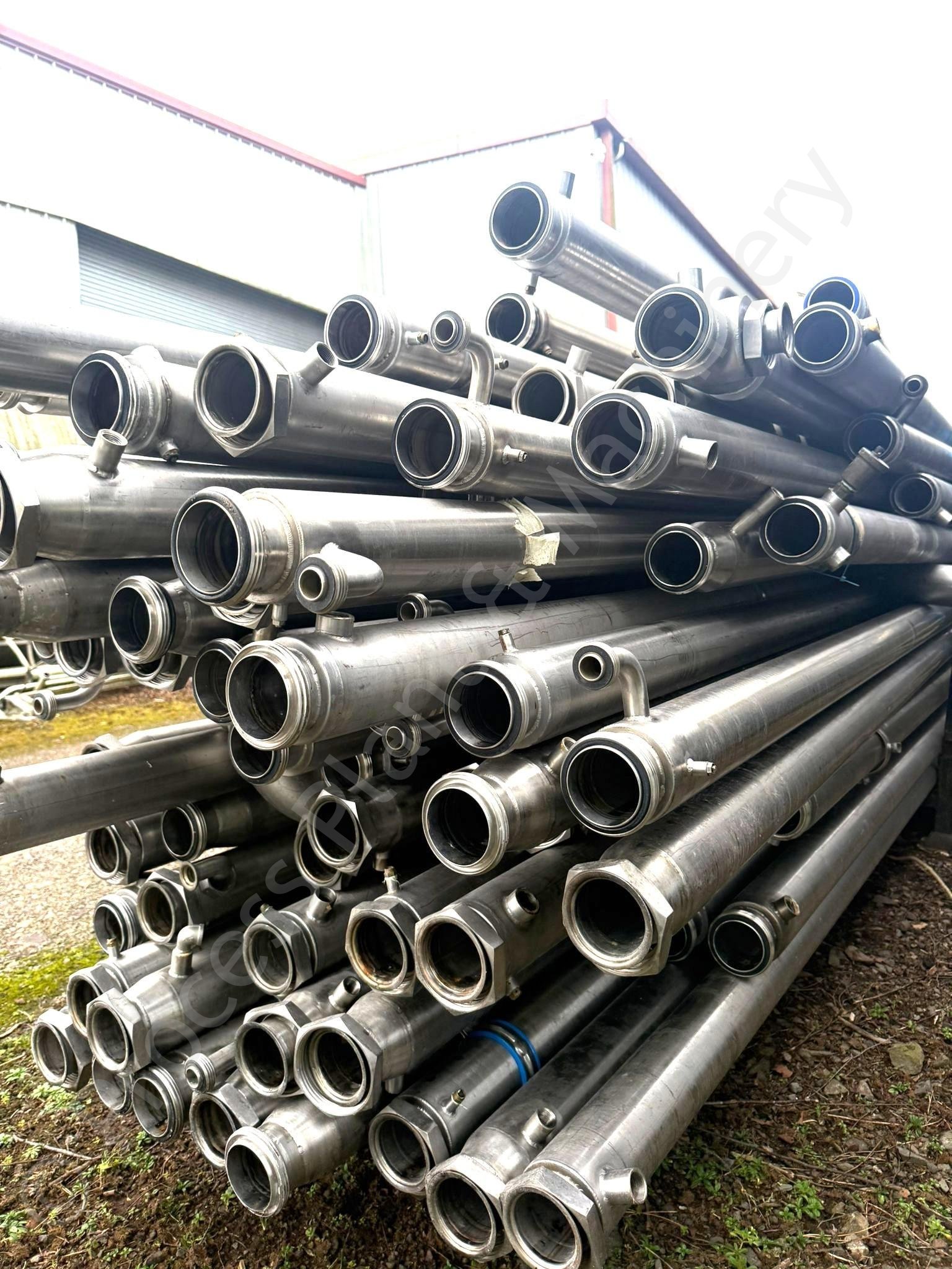 These are Various Lengths of 3 inch and 4 inch Stainless Steel Jacketed Pipework, suitable for Chocolate Processing Facilities, available in stock at Lockerbie, Scotland for immediate sale.